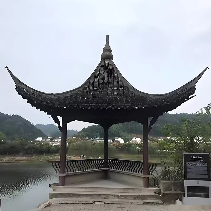 Támogatja a nem szabványos méretek testreszabását (3000-6000 mm), lefedve a klasszikus Huizhou formákat, például a négysarkos toronypavilonokat, a hatsarkos pavilonokat és a nyolcsarkos pavilonokat. A faanyagok között szerepel borneol, fenyő, konzerváló fenyő stb., a csempe típusai pedig testre szabhatók kis zöld és hengeres csempével. A telepítés betonalapot alkalmaz az oszlopok rögzítéséhez, a bemetszéssel és csappal kialakított szerkezet helyszíni összeillesztésével elkerülhető, hogy az összeszerelés hevesen károsítsa a csapokat. A tetőt professzionális csempézők rakják le Huizhou kézműves munkája szerint, hogy biztosítsák a zökkenőmentes vízelvezetést, és az egész megőrzi a Huizhou ősi építészetének szabályosságát és varázsát.