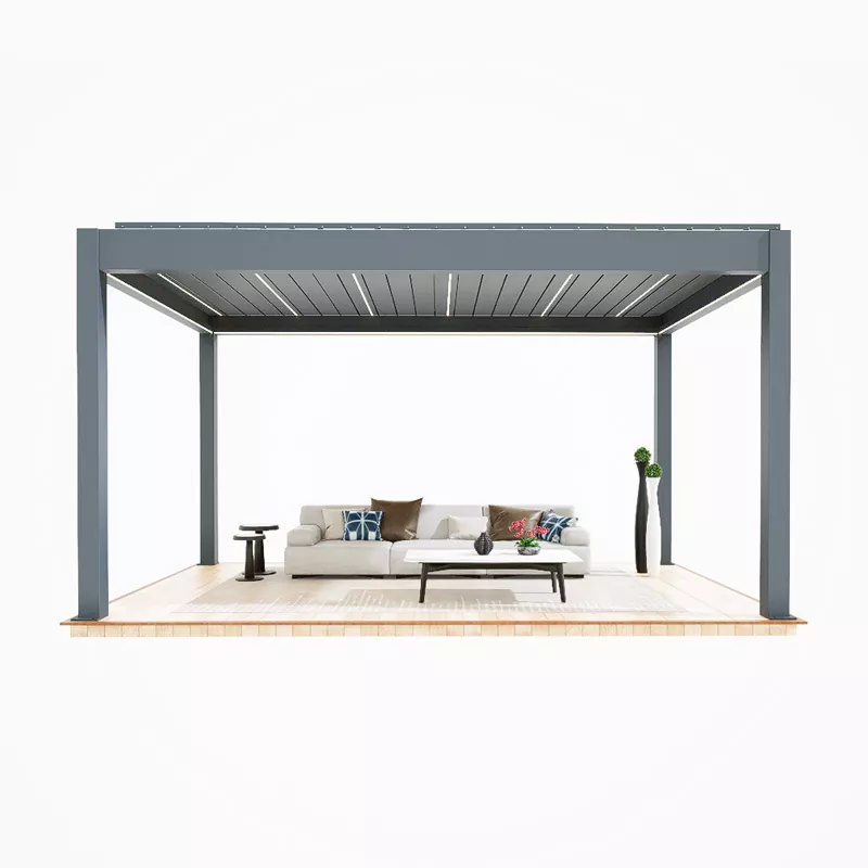 Az intelligens vezérlőpavilon fő előnye a "minimalista esztétika + intelligens mag"-ban rejlik. Az áramvonalas vonalkialakításnak köszönhetően láthatatlanul integrálja az olyan modulokat, mint az intelligens napernyő, világítás, szél és eső indukció, megőrizve az átlátszó és letisztult minimalista megjelenést, miközben teljes forgatókönyvű automatikus vezérlést tesz lehetővé. A fő test könnyű alumíniumötvözet profilokból készül, matt fluor-szénhidrogén bevonattal, kiegyensúlyozva az időjárásállóságot, a korrózióállóságot és a textúrát. Az intelligens komponensek IP65 vízálló kialakítást alkalmaznak, így alkalmazkodnak a bonyolult kültéri környezetekhez. Az APP-n keresztül távolról vezérelhető, és hangutasításokkal működtethető, olyan funkciókat valósítva meg, mint a napernyő automatikus nyitása és zárása, fokozatos világításváltás, valamint a szélre és esőre reagáló automatikus zárás, egyensúlyba hozva a kényelmet és a technológiai érzéket.