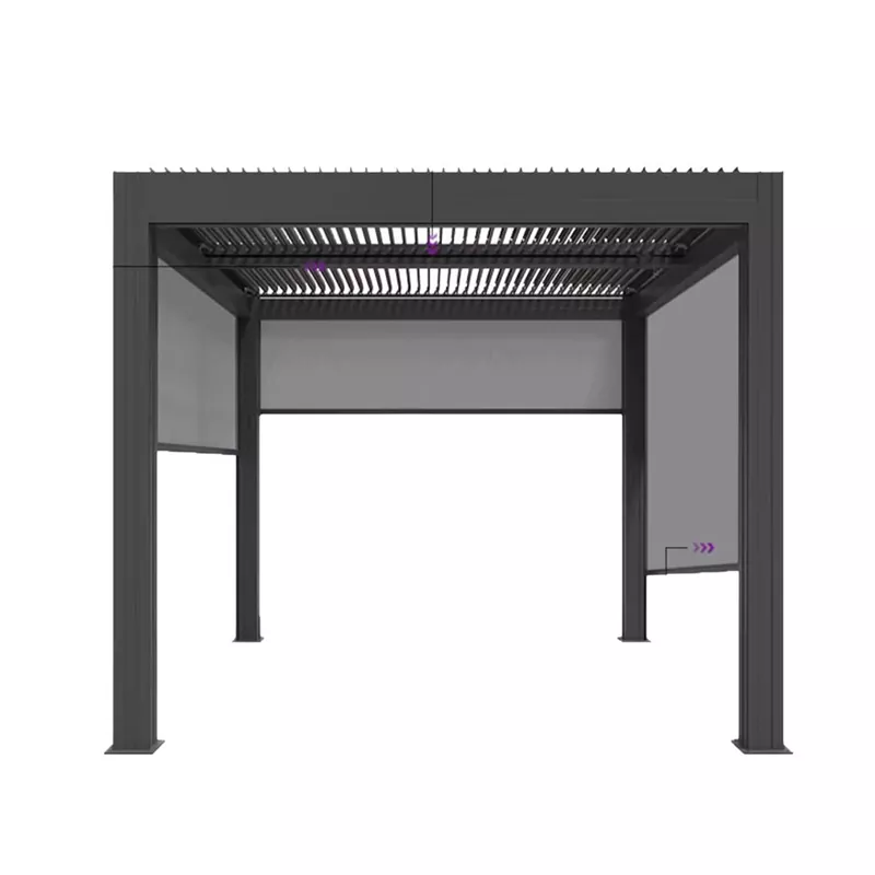 Courtyard Intelligens pavilon (3000×3000mm): 60×60 mm-es oszlopok, edzett üvegtető + intelligens napernyő, alkalmas privát udvarokhoz;